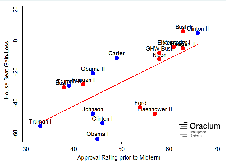 Figure 1: Presidential approval ratings and their parties’ House midterm results