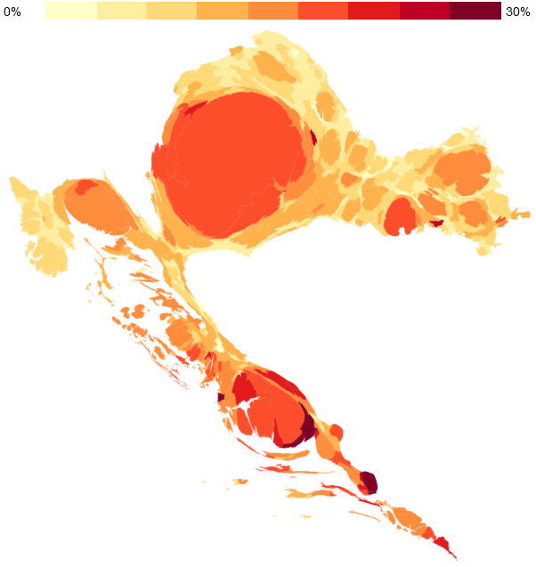 Even though cartograms have a long history, they are rarely used in the media coverage of elections. For example, this type of visualization of election results has never been used in Croatia. Hence, for the first time ever, we created such a map for the daily newspaper Jutarnji list, where the mapping polygons are municipalities and cities (556 of them in total).