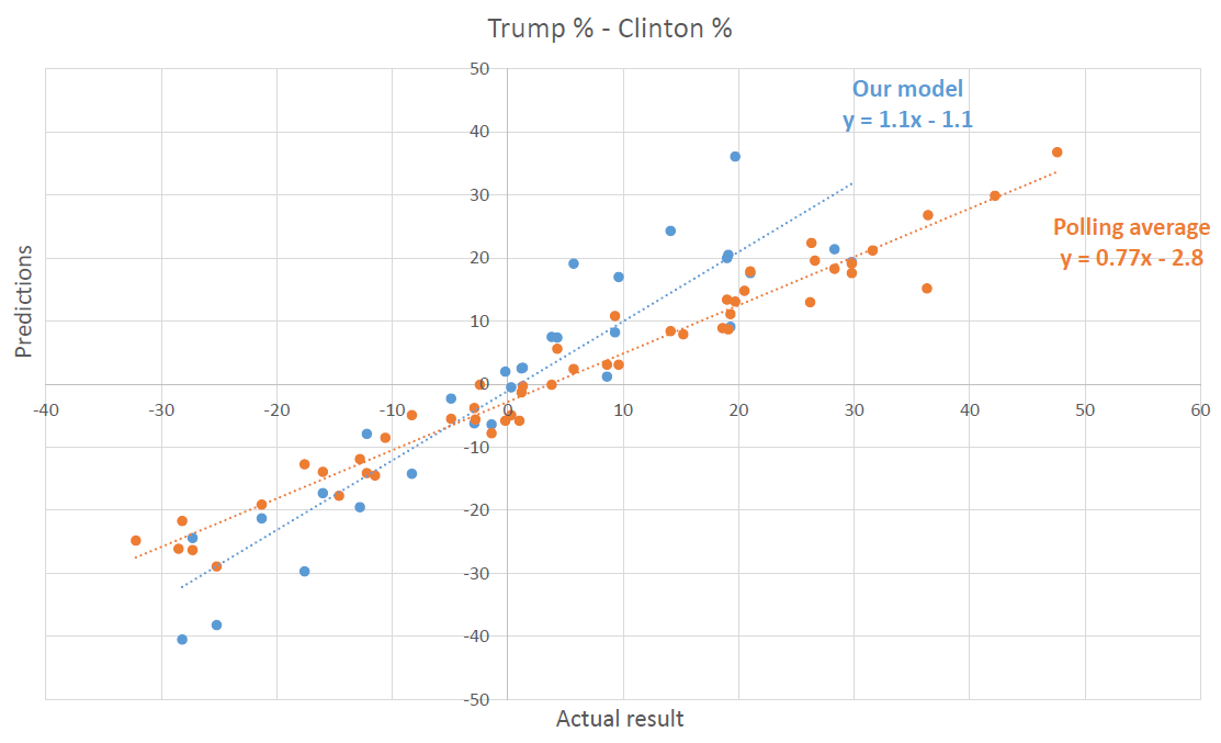 The second graph therefore compares the success of our method (x-axis) with the success of the polling average (y-axis) for the difference between the predicted and actual vote share for Donald Trump. In other words, for the polling average any dots beyond the horizontal line overestimate Trump, while any dots under the horizontal line underestimate him. For our model the overestimation is to the right of the vertical line, and the underestimation is to the left of it.