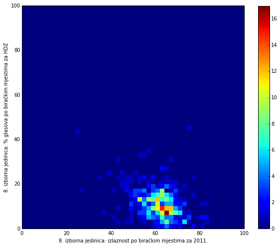 Figure 3. The graph shows the difference in % of votes for Josipovic and Grabar Kitarovic on presidential elections with respect to total turnout for each voting station.